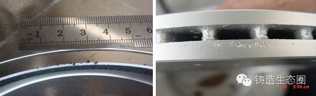 ⑸同炉铁液浇注结构类似制动盘,用冷芯盒树脂砂芯生产的铸件有氮气孔缺陷,不下芯的单片制动盘或合脂油芯铸件出现这种缺陷。