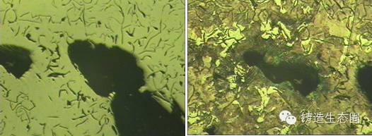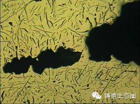 ⑷孔洞周围通常没有石墨,氮在石墨与基体界面上的吸附和在石墨中的固溶是氮使石墨组织形态发生变化。气孔附近石墨短小弯曲,往往伴随着许多铁素体,通过这一特征,可以将氮气孔和缩松区别开,缩松形貌见图4。