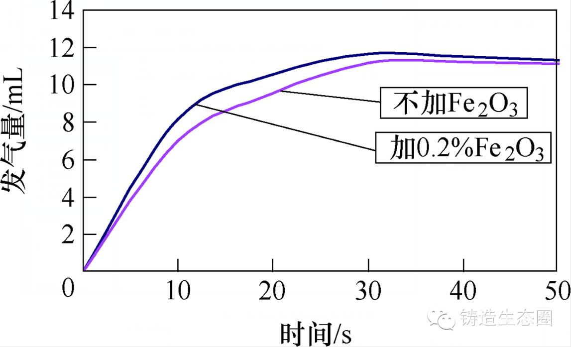 图5 加Fe2O3与不加Fe2O3芯子发气量